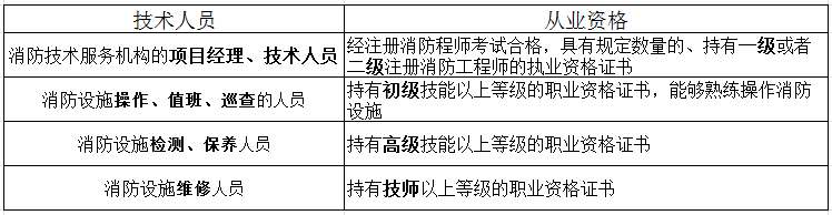 消防设施维修人员,经消防行业特有工种职业技能鉴定合格,持有高级技能以上等级的职业资格证书