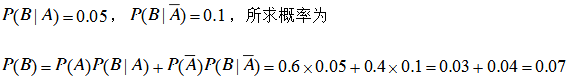 某用户从两厂家进了一批同类型的产品,其中甲厂生产的占60%,若甲、乙两厂产品的次品率分别为5%、10%,今从这批产品中任取一个,求其为次品的概率。