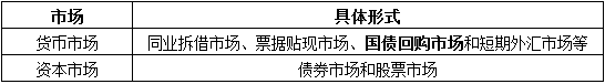 融市场可以分为货币市场、资本市场、外汇市场和黄金市场。其中,货币市场与资本市场的具体表现形式如下: