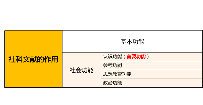 。社会科学文献的作用主要分为两部分:基本功能和社会功能,具体如下表: