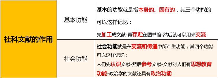 本题考查社会科学文献的作用。社会科学文献的作用主要分为两部分:基本功能和社会功能,具体如下表: