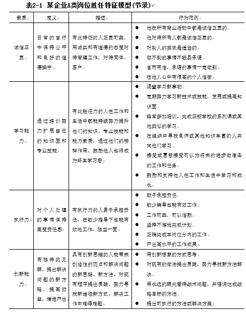 由表2-1 某企业A类岗位胜任特征模型(节录)可知