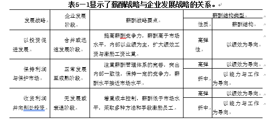 表5—1显示了薪酬战略与企业发展战略的关系,由图可知,以投资促进发展的公司的薪酬水平一般高于市场的平均水平。