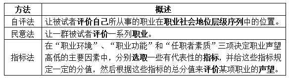 职业声望的调查与评价主要有以下3种方法:① 自评法;② 民意法;③ 指标法,并根据理解记忆对这三种方法做相应的解释:
